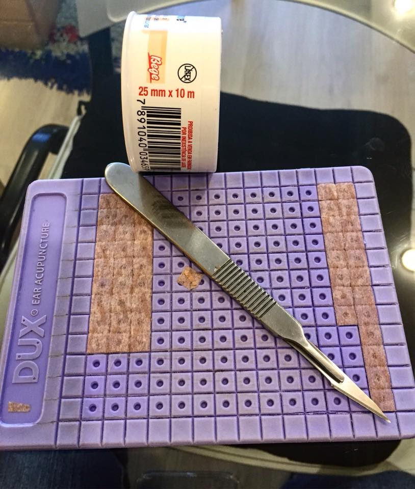 Muito bem, as placas de acupuntura auricular possuem atualmente um tamanho padronizado. A minha é uma DUX pequena. Gosto desta marca pois ela não junta restos de cola quando os pontos da placa acabam.