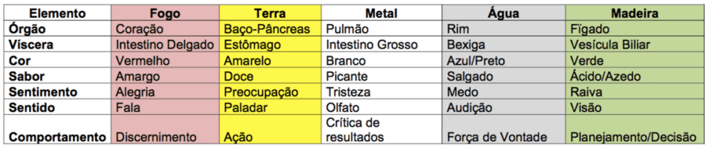 Assim, cada órgão e víscera é representado por um elemento, assim como, cores, sabores, sentimentos, sentidos também, como apresentado na tabela abaixo: