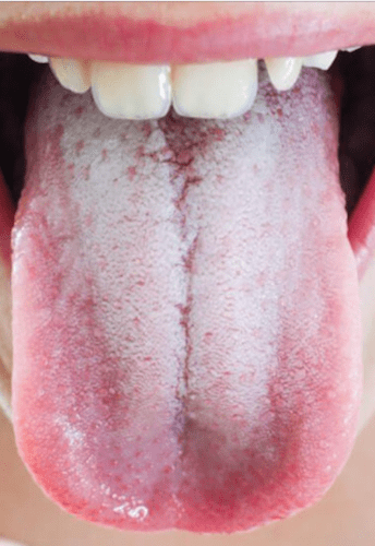 Na imagem é possível ver que a saburra está branca, espessa e presente apenas na raiz e no centro da língua.