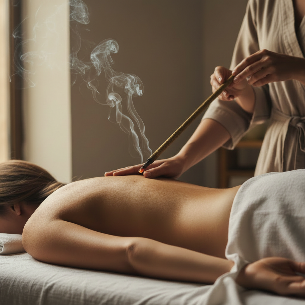 Paciente recebendo tratamento com moxabustão chinesa. O bastão de moxa está mais curto. Uma das mãos do terapeuta toca as costas do paciente e a outra segura o bastão de moxa. Não há nada além da moxa nas costas do paciente.